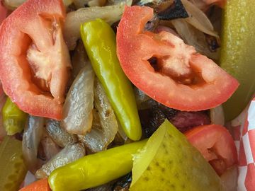 Seasoned fries | Mild sauce | Honey mustard | Chopped onions | Chicago relish | Sport peppers | Diced tomatoes | Diced pickles | Mustard | Celery salt